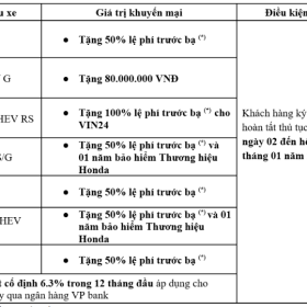 Nhằm tri ân khách hàng đã luôn ủng hộ và tin tưởng các sản phẩm của Honda trong thời gian qua, Công ty Honda Việt Nam phối hợp cùng các Nhà Phân phối Ôtô Honda trên toàn quốc triển khai chương trình khuyến mại đặc biệt nhân dịp Tết Nguyên đán: “Hỗ trợ 100% lệ phí trước bạ xe Honda CRV” với thông tin chi tiết như sau: